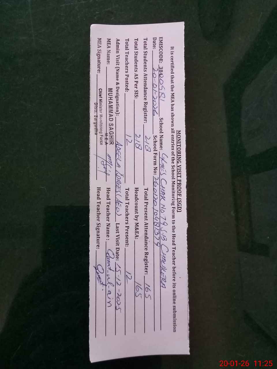 | Attendance Register | Head Teacher | MEA with School | Visit Proof |