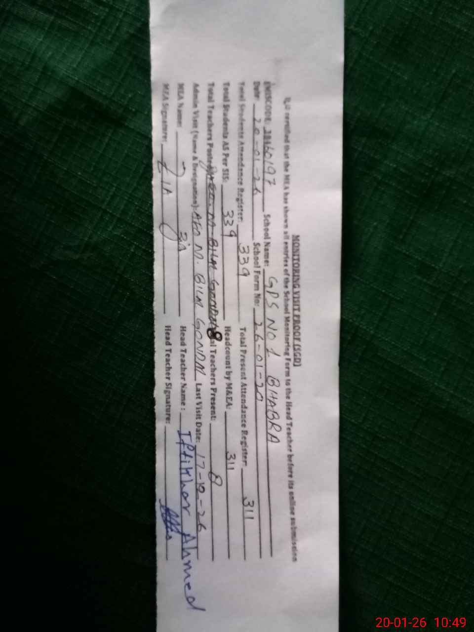 | Attendance Register | Head Teacher | MEA with School | Visit Proof |