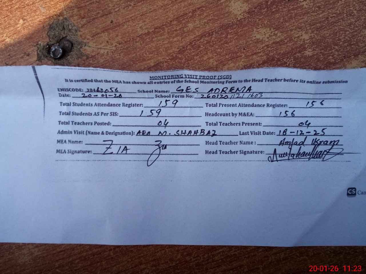 | Attendance Register | Head Teacher | MEA with School | Visit Proof |
