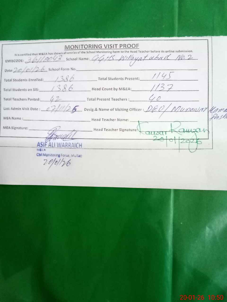 | EMIS Code: 36110043 | Name of School: GGHS WILLAYAT ABAD NO.2 MULTAN | |||