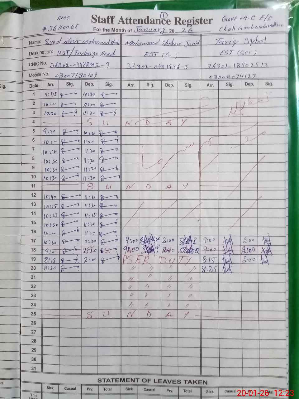 | CNIC | Full Name | Designation | R/C | Absence during last cal. month |