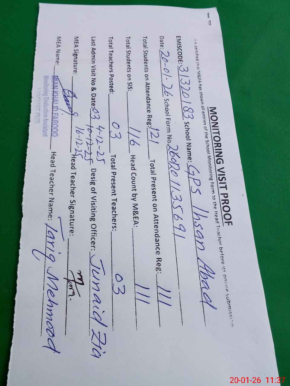 | EMIS Code: 31320183 | Name of School: GPS IHSAN ABAD | |||
