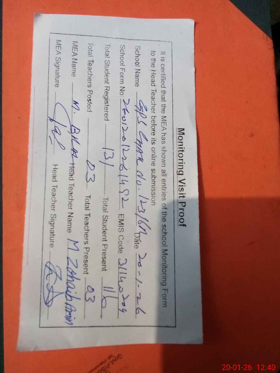 | Attendance Register | Head Teacher | MEA with School | Visit Proof |