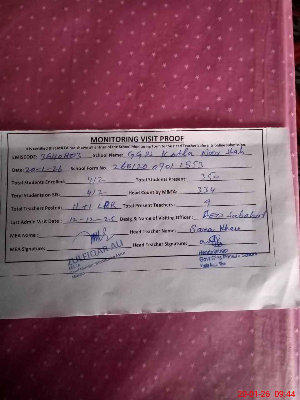 | Attendance Register | Head Teacher | MEA with School | Visit Proof |