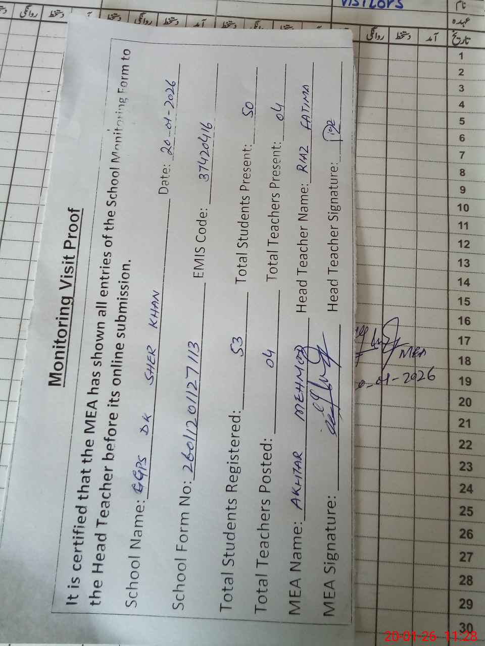 | Attendance Register | Head Teacher | MEA with School | Visit Proof |