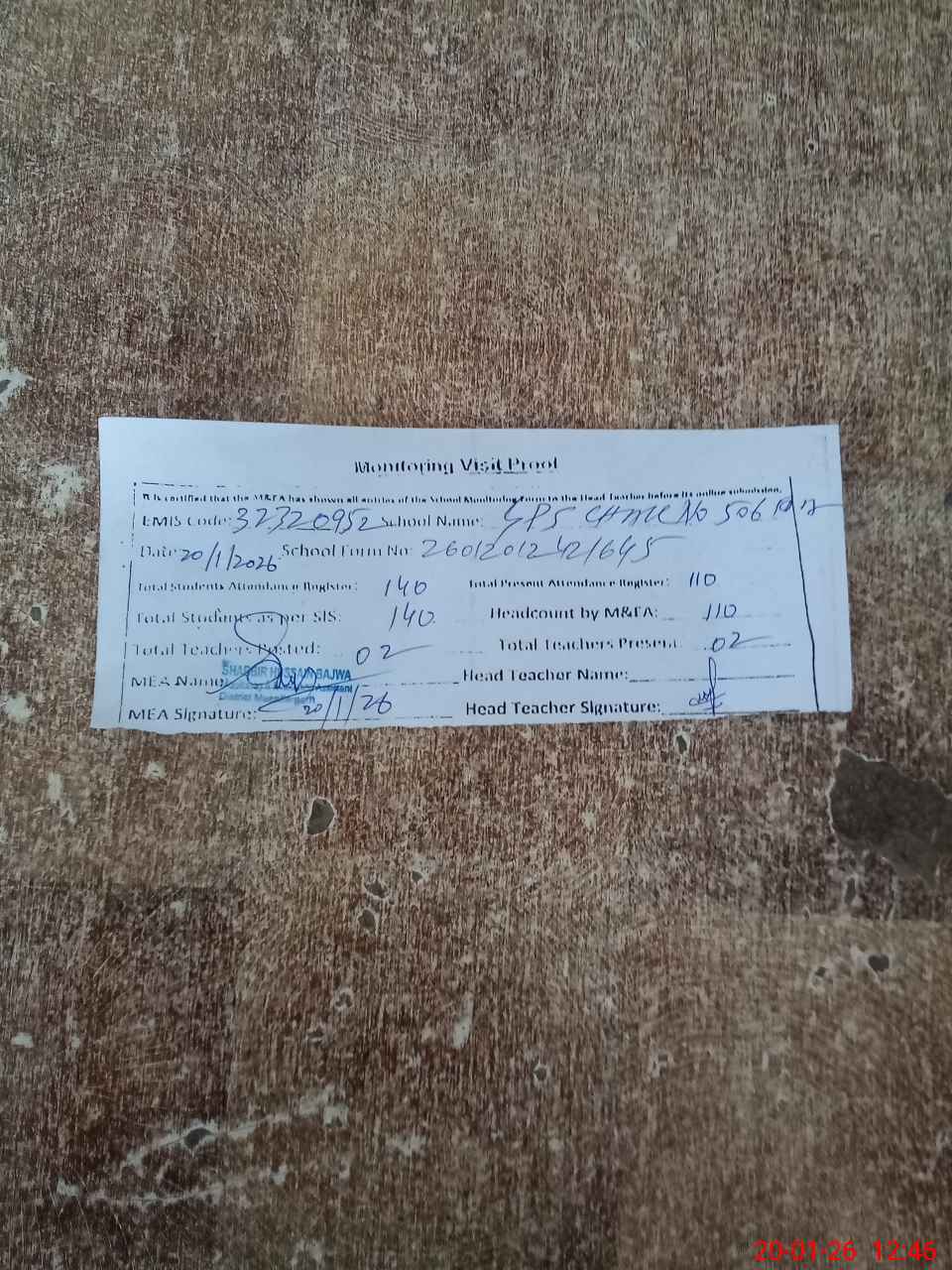 | Attendance Register | Head Teacher | MEA with School | Visit Proof |