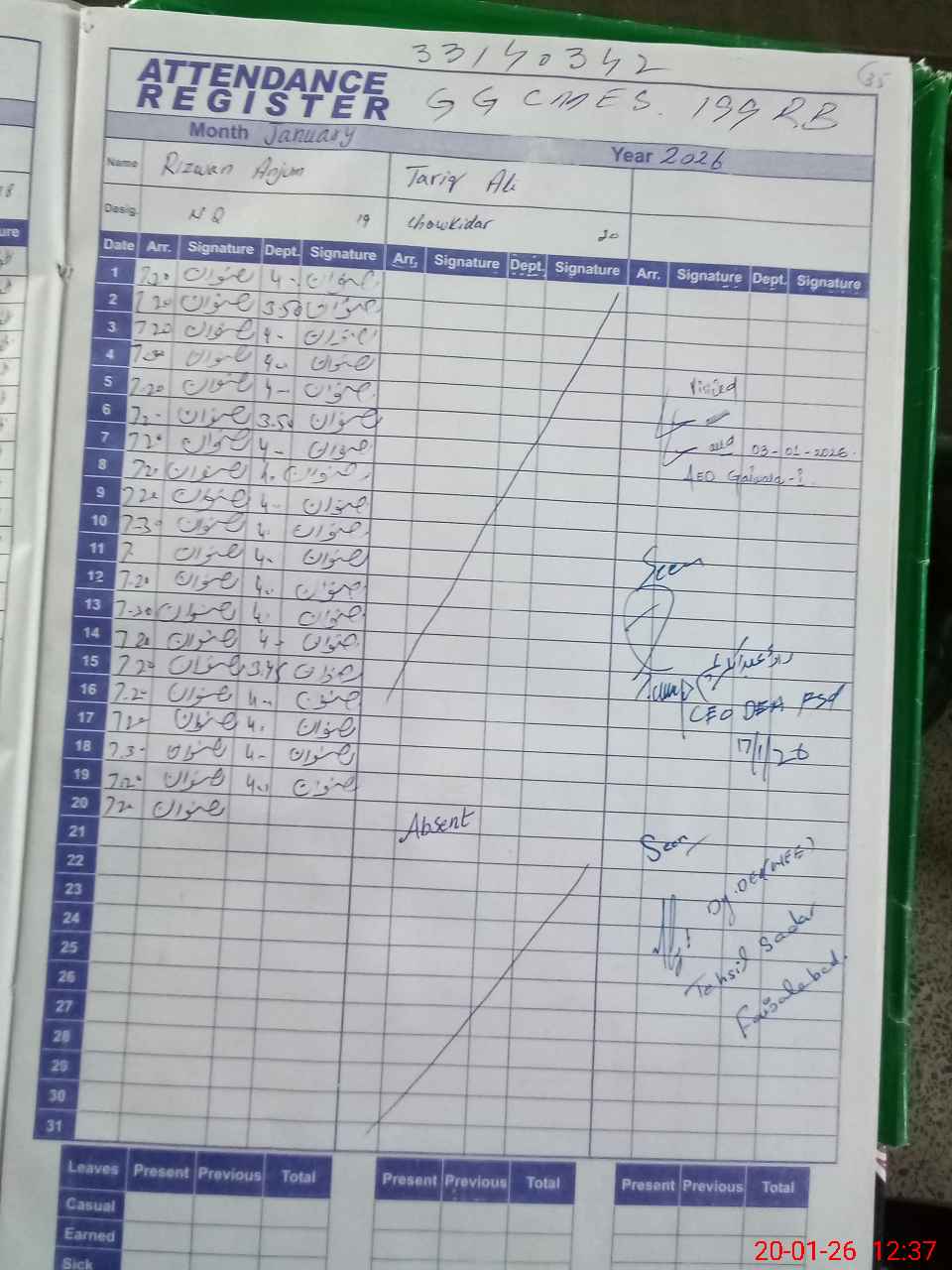 | 33**** | Ta**** | CHOKIDAR | 0 | 0 | 31 | 0 | 0 | 0 | 0 | 0 | 0 | Absent (Un-Authorized) | |