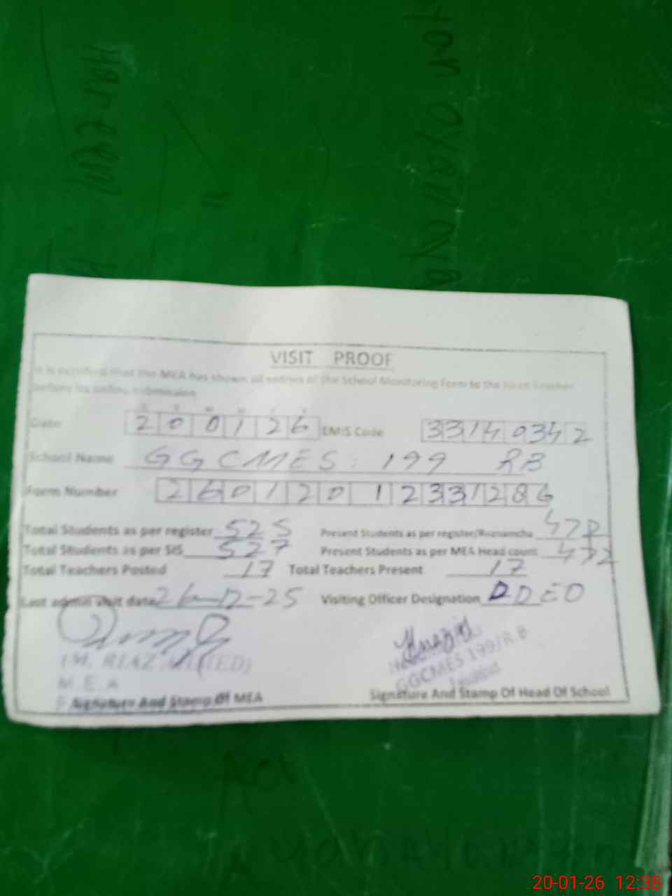 | Attendance Register | Head Teacher | MEA with School | Visit Proof |