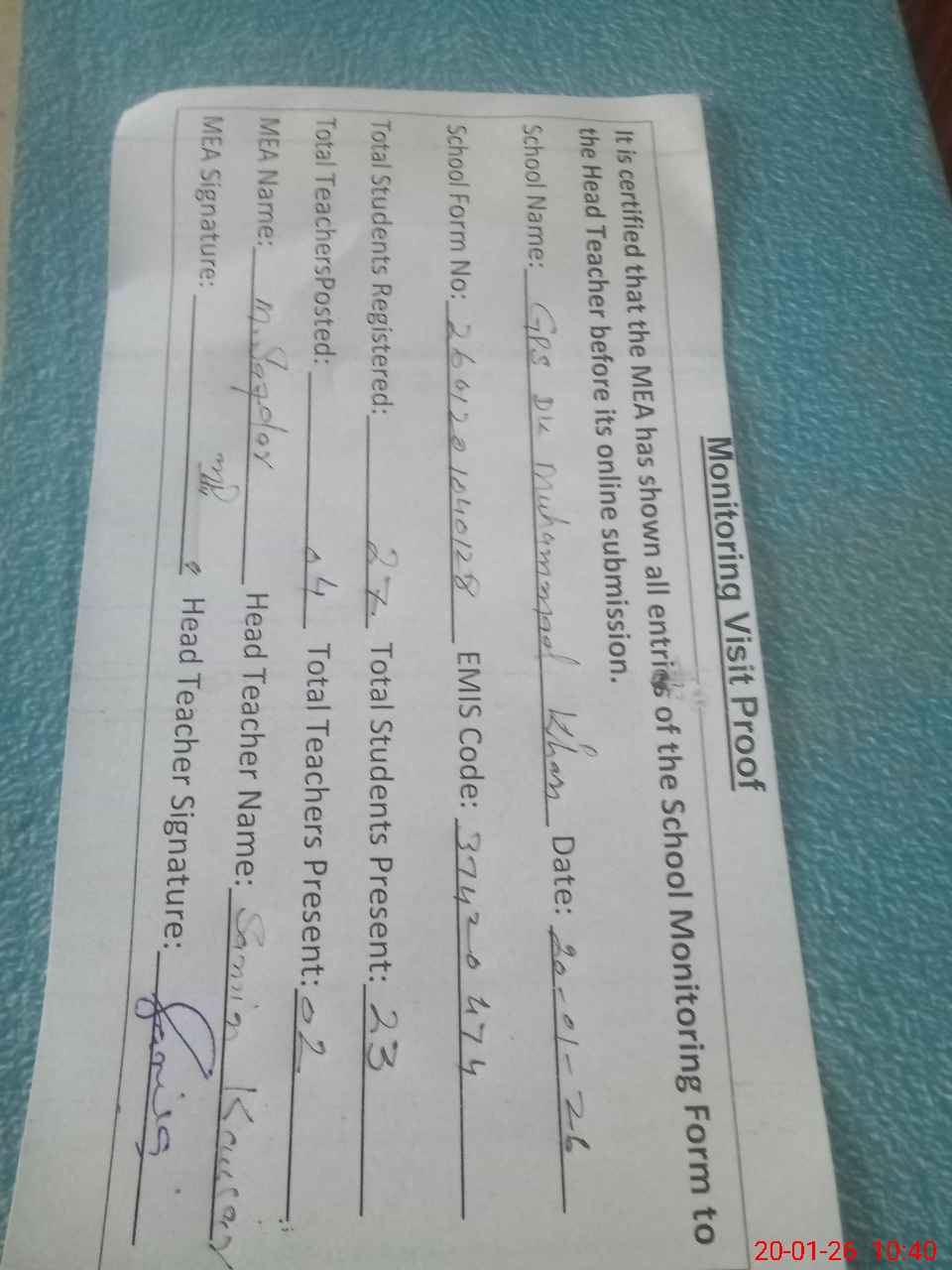 | Attendance Register | Head Teacher | MEA with School | Visit Proof |