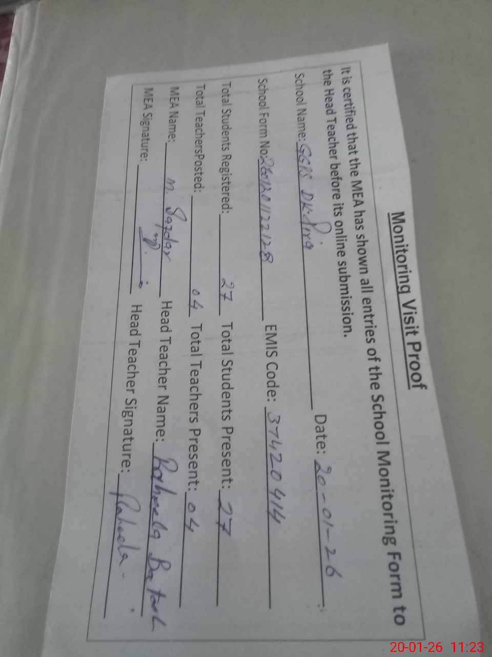 | Attendance Register | Head Teacher | MEA with School | Visit Proof |