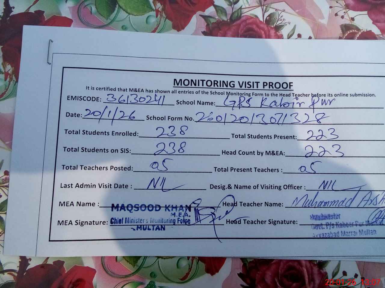 | Attendance Register | Head Teacher | MEA with School | Visit Proof |