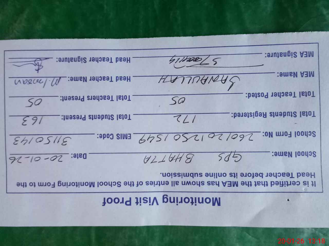| EMIS Code: 31150143 | Name of School: GPS BHATTA | |||
