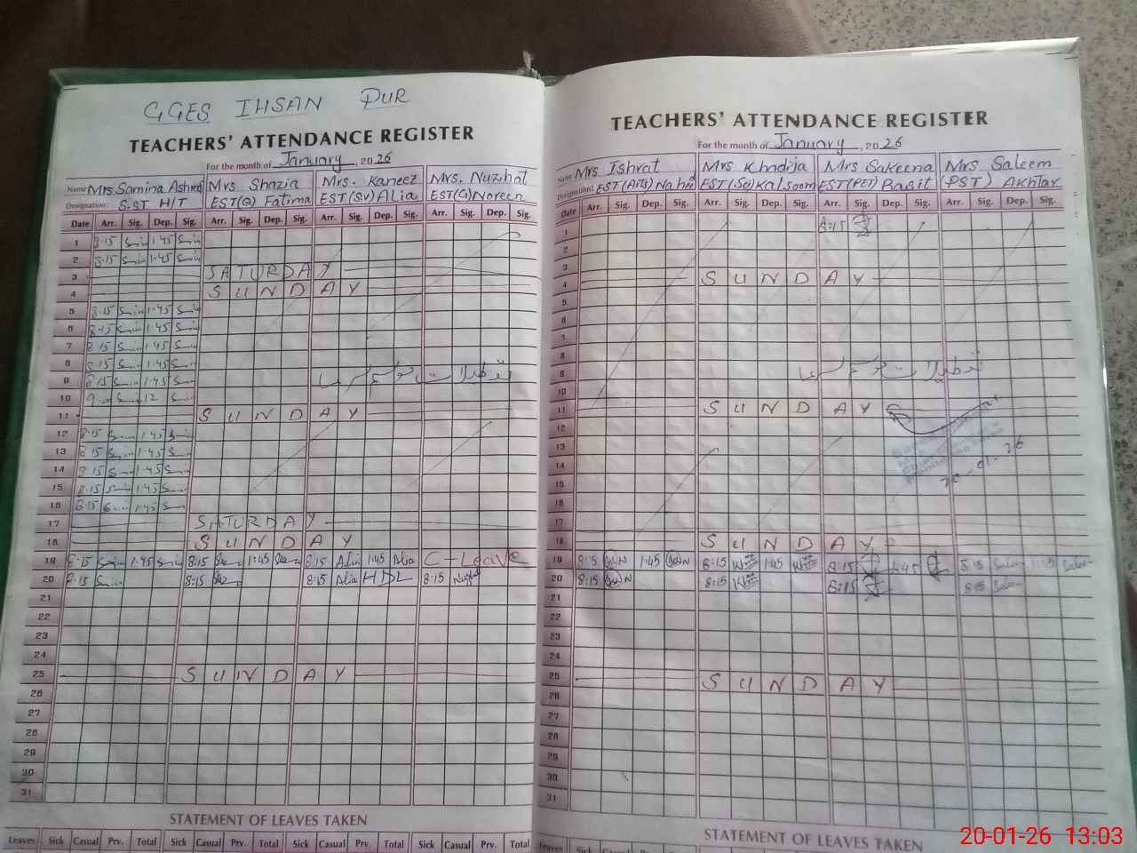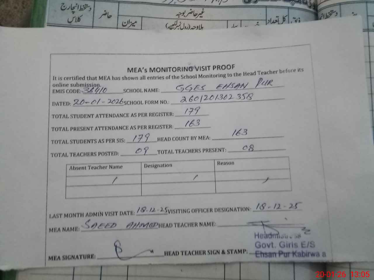| Attendance Register | Head Teacher | MEA with School | Visit Proof |