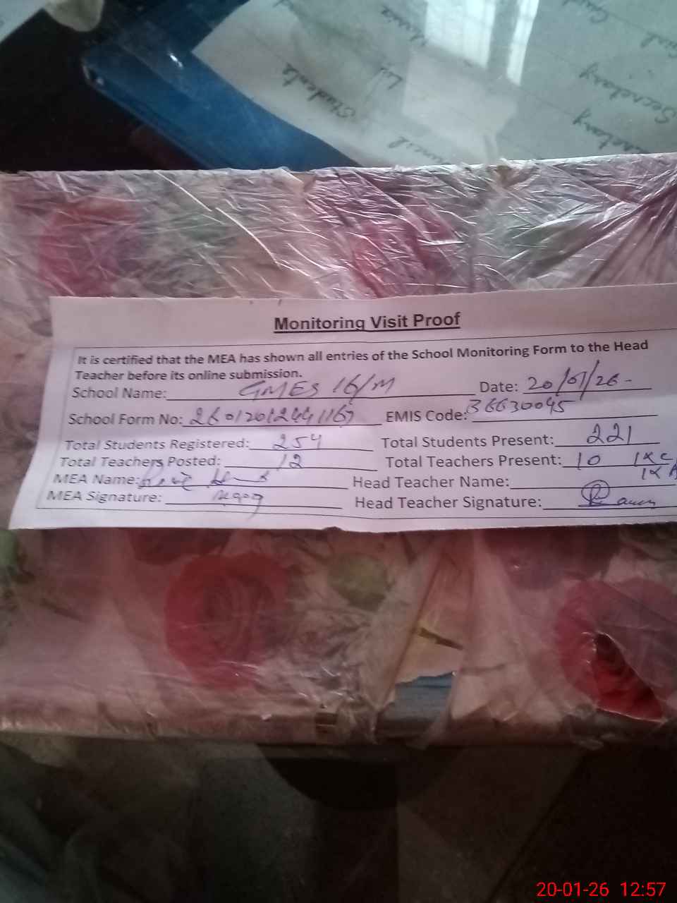 | Attendance Register | Head Teacher | MEA with School | Visit Proof |