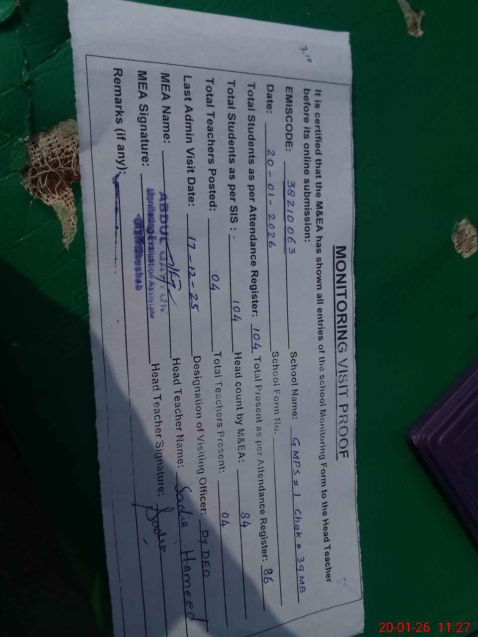 | Attendance Register | Head Teacher | MEA with School | Visit Proof |
