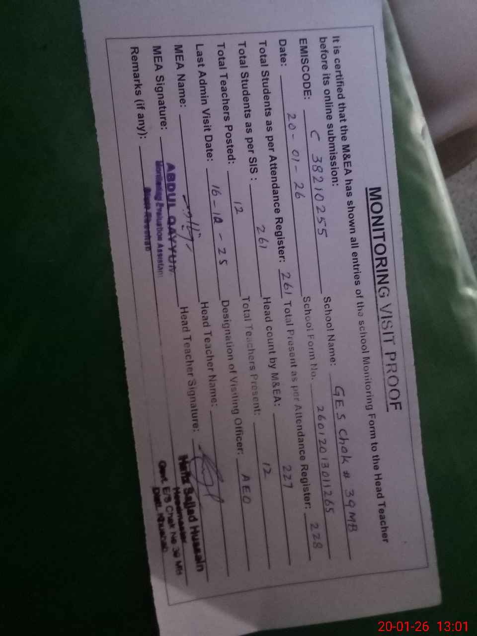 | EMIS Code: 38210255 | Name of School: GES CHAK NO 39 MB | |||
