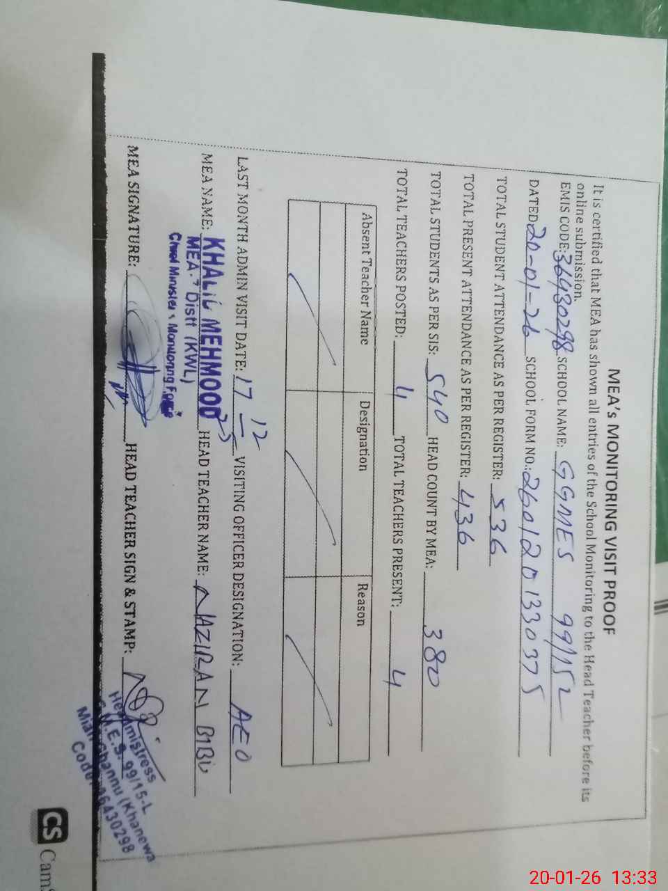 | Attendance Register | Head Teacher | MEA with School | Visit Proof |