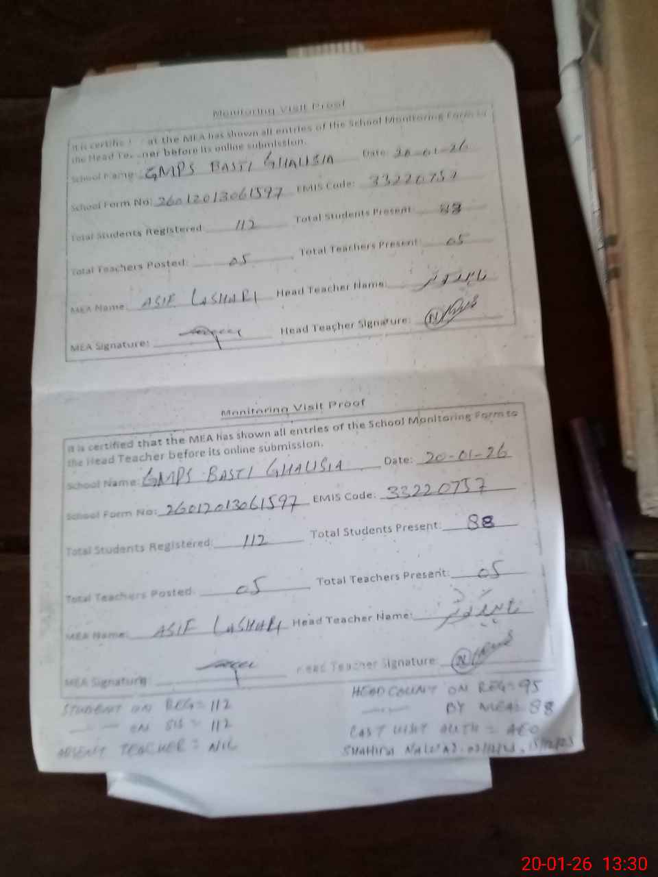 | Attendance Register | Head Teacher | MEA with School | Visit Proof |