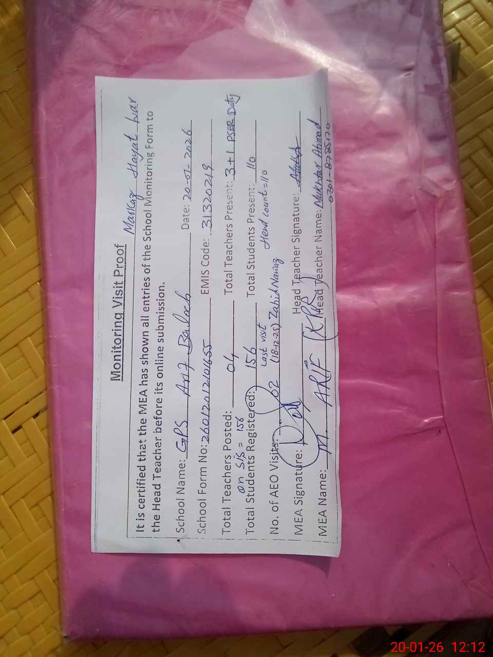 | Attendance Register | Head Teacher | MEA with School | Visit Proof |