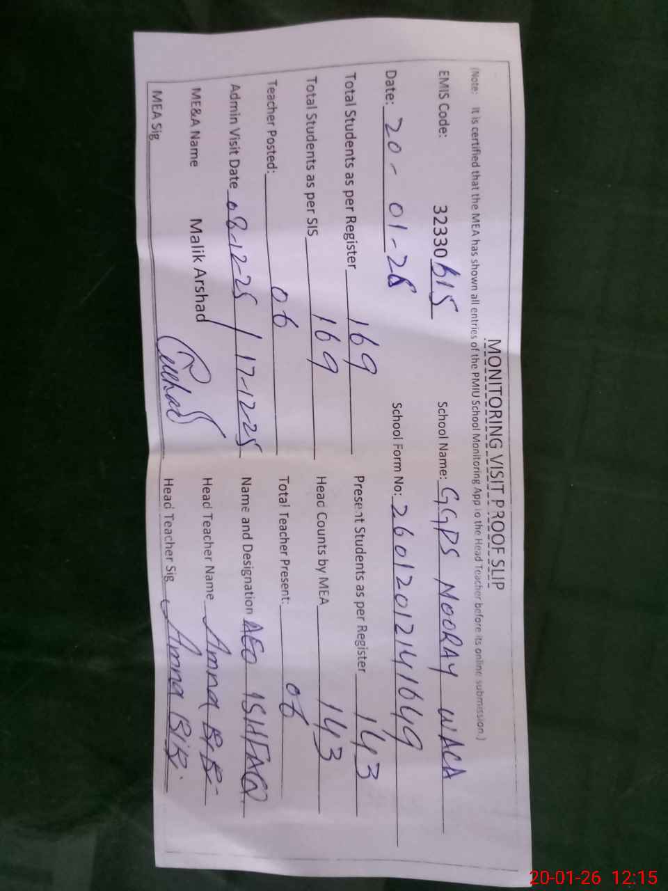 | Attendance Register | Head Teacher | MEA with School | Visit Proof |