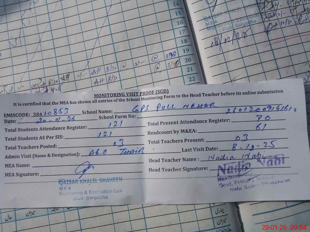 | Attendance Register | Head Teacher | MEA with School | Visit Proof |