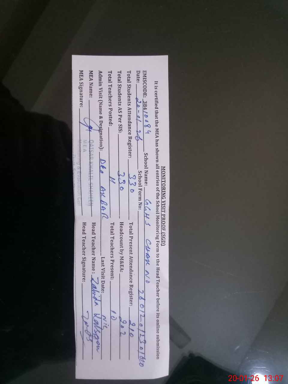 | Attendance Register | Head Teacher | MEA with School | Visit Proof |