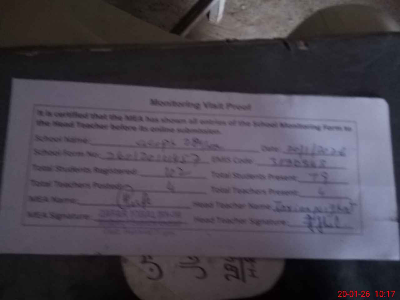 | Attendance Register | Head Teacher | MEA with School | Visit Proof |