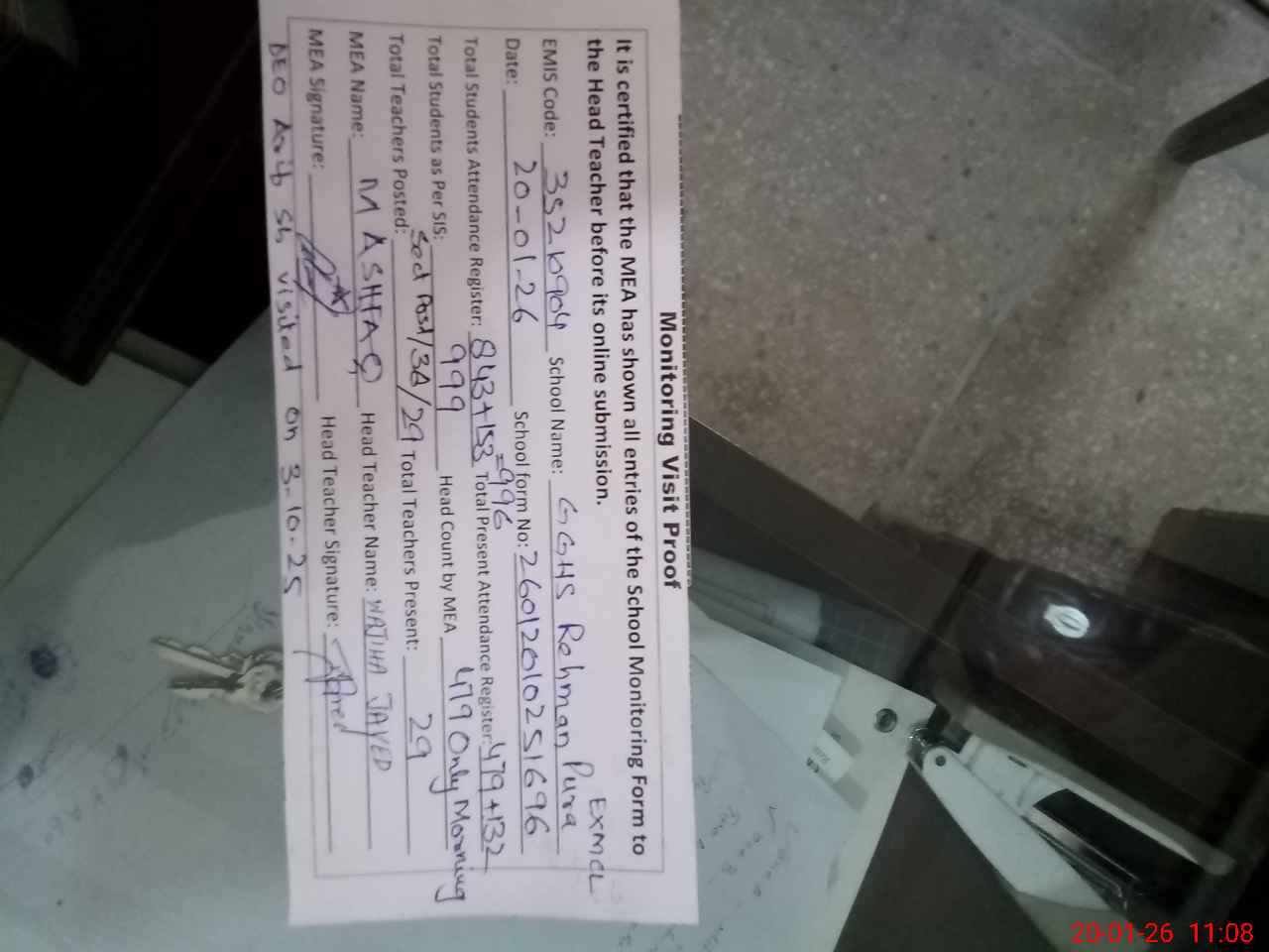 | Attendance Register | Head Teacher | MEA with School | Visit Proof |