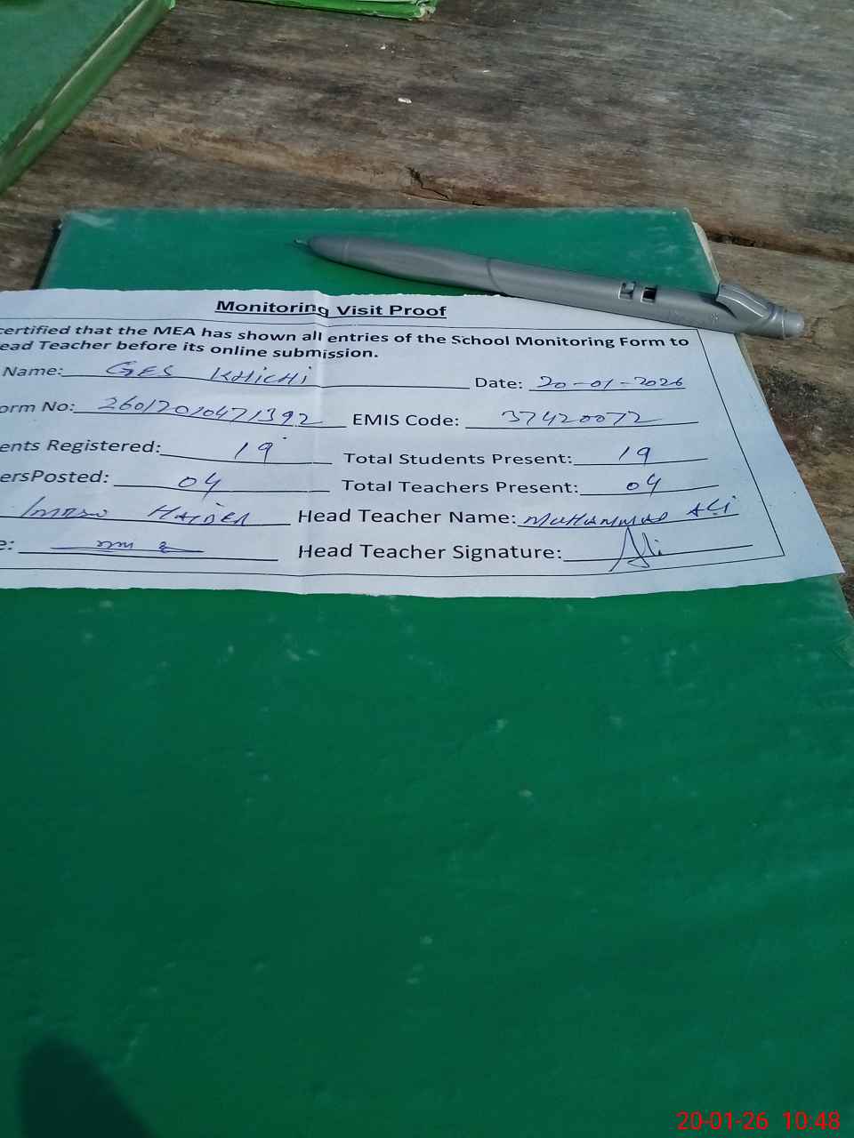 | Attendance Register | Head Teacher | MEA with School | Visit Proof |
