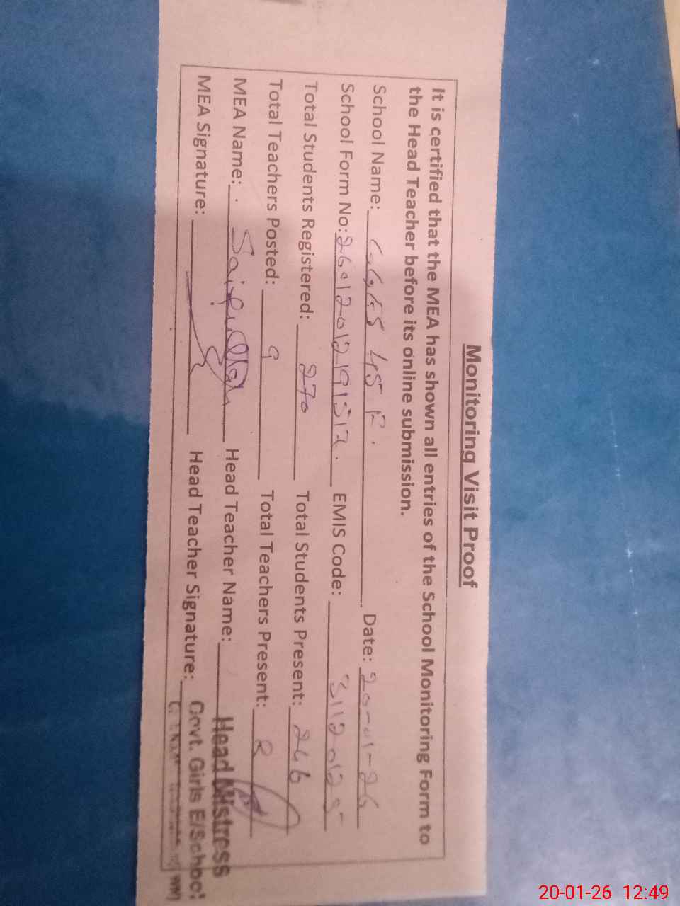 | Attendance Register | Head Teacher | MEA with School | Visit Proof |