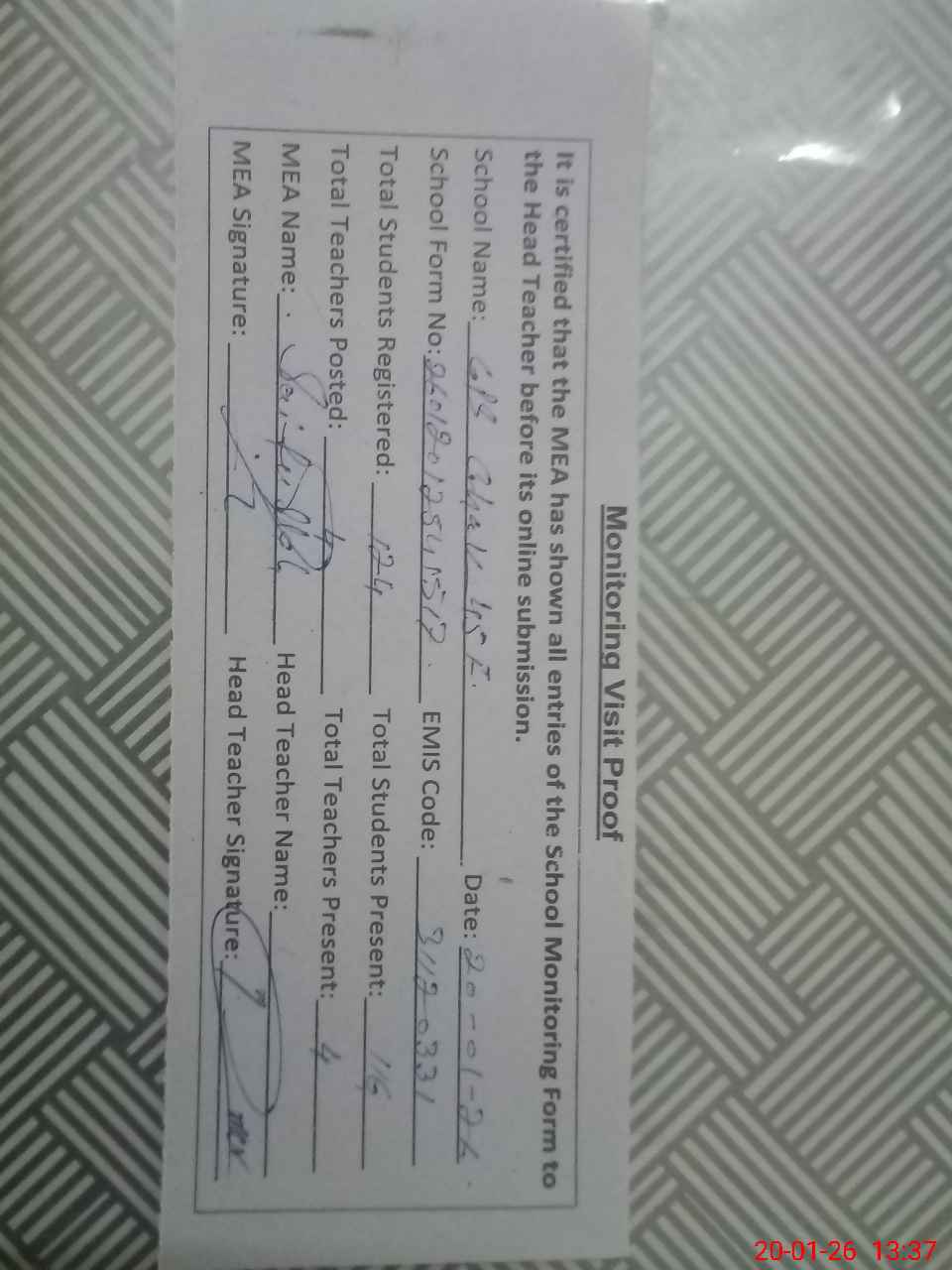 | Attendance Register | Head Teacher | MEA with School | Visit Proof |