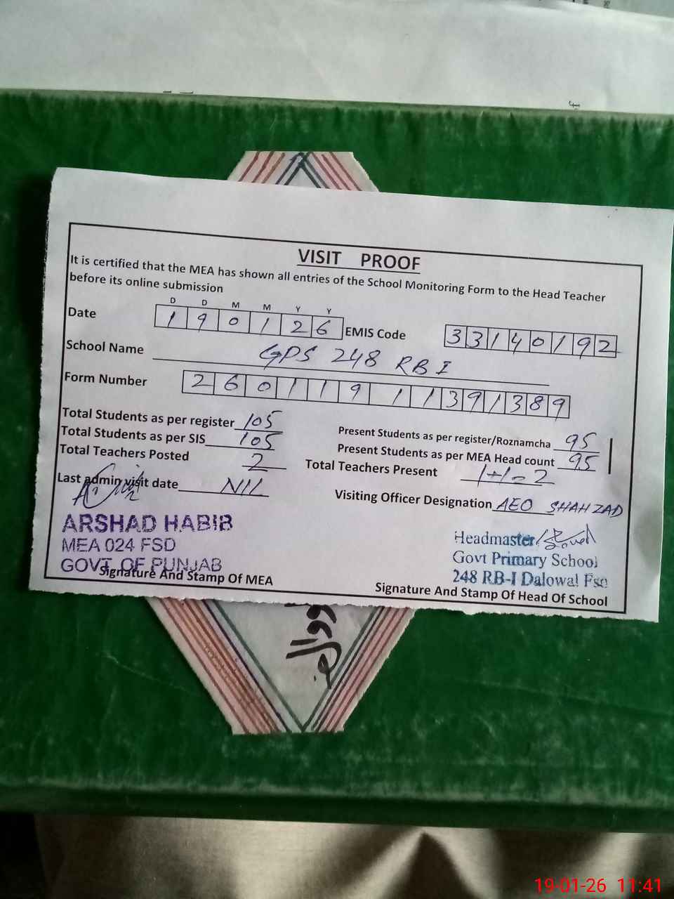| Certified that this School was Inspected by the Undersigned MEA/DMO Today and the Information Stated Above is as Per Record. | |||||