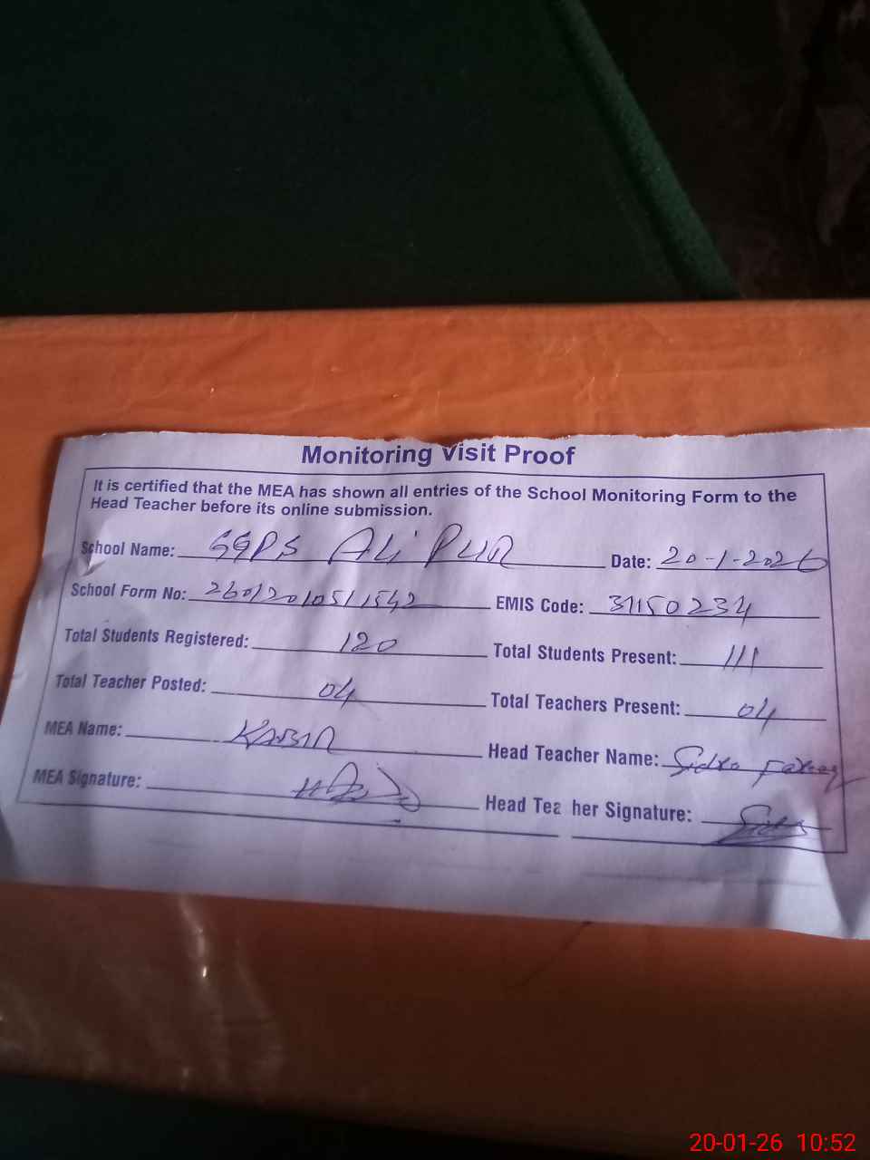 | Attendance Register | Head Teacher | MEA with School | Visit Proof |
