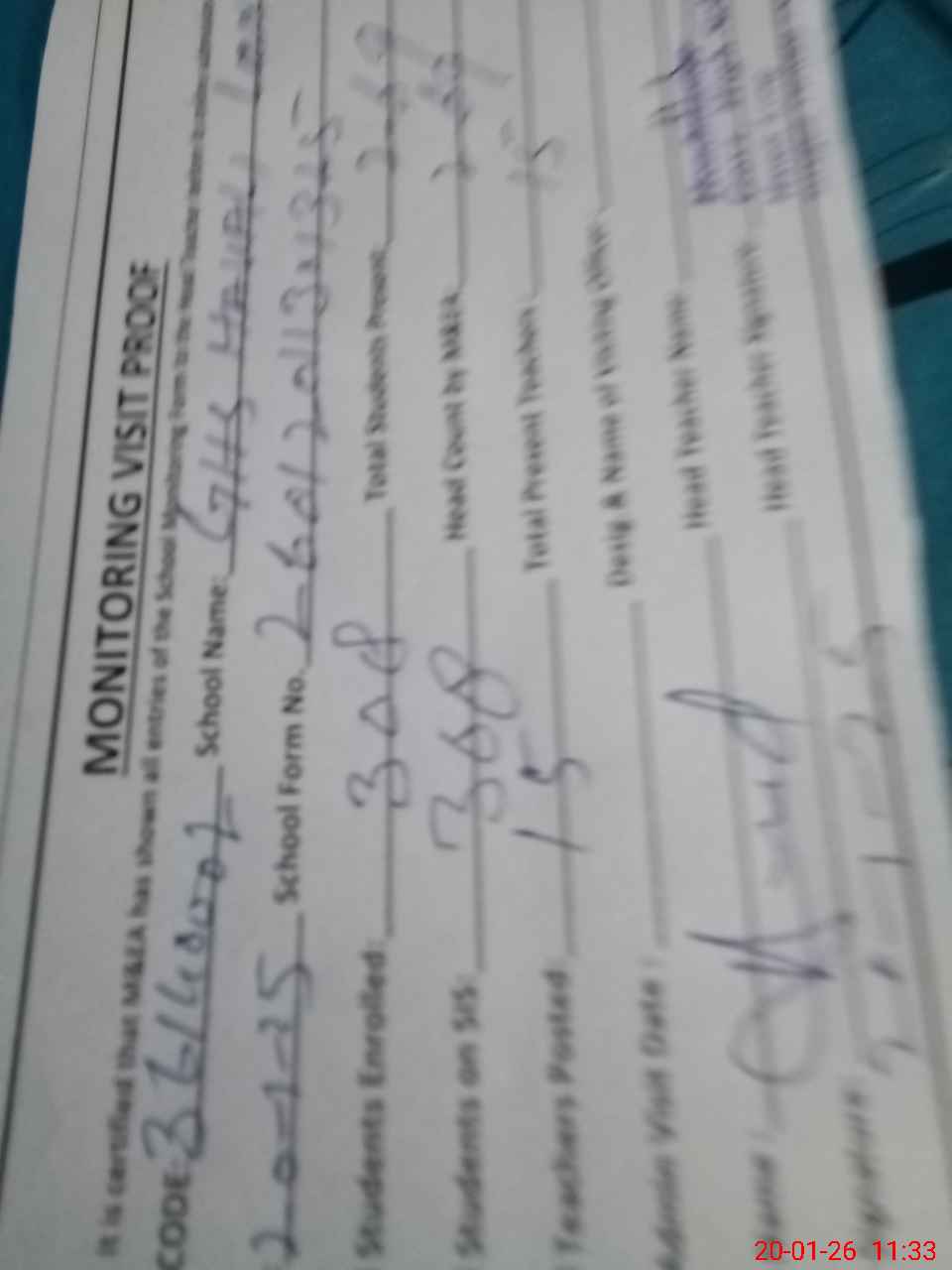 | Attendance Register | Head Teacher | MEA with School | Visit Proof |