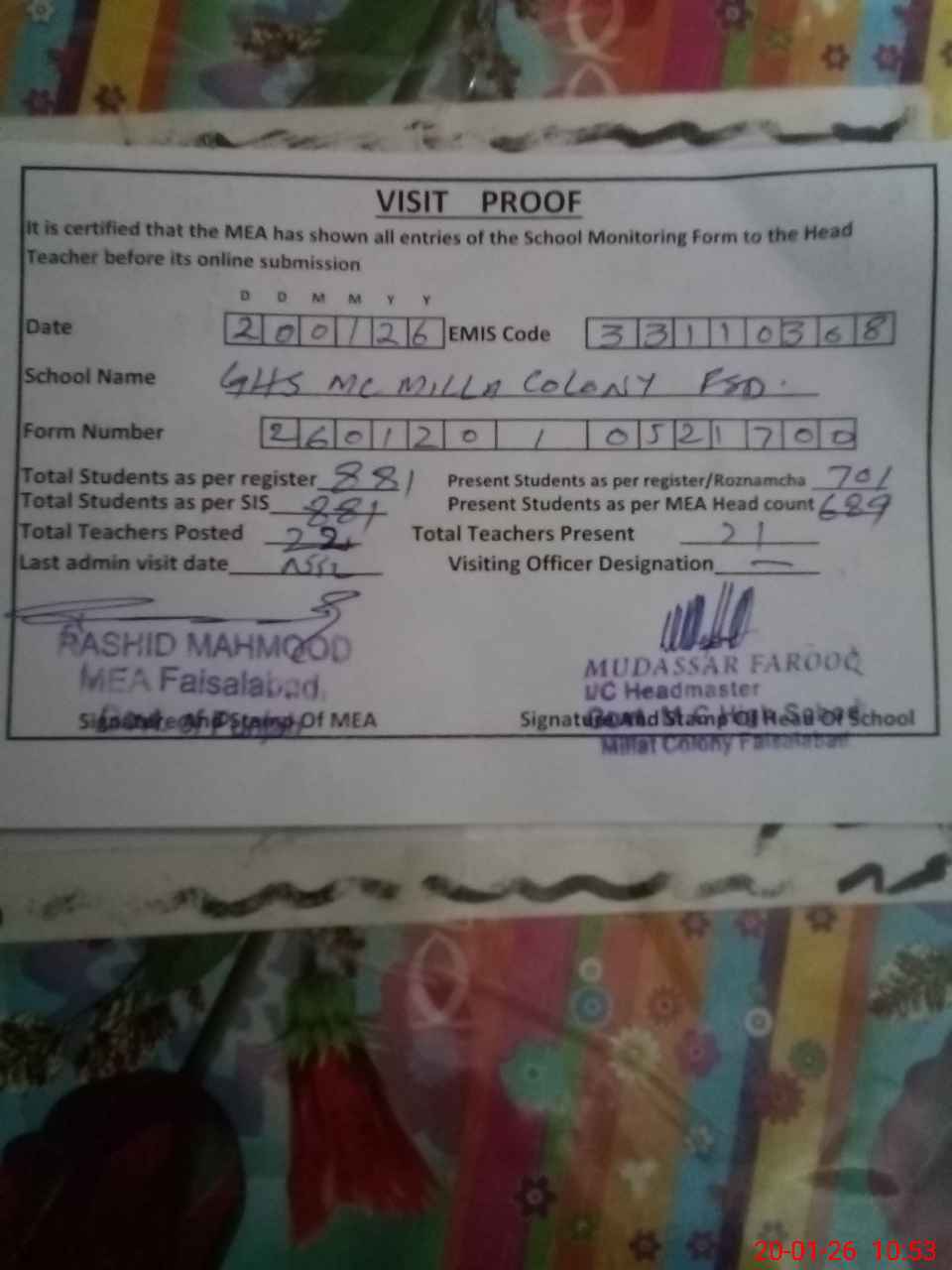 | EMIS Code: 33110308 | Name of School: GHS MC MILLAT COLONY FSD | |||