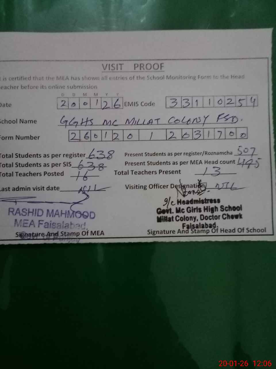 | Attendance Register | Head Teacher | MEA with School | Visit Proof |