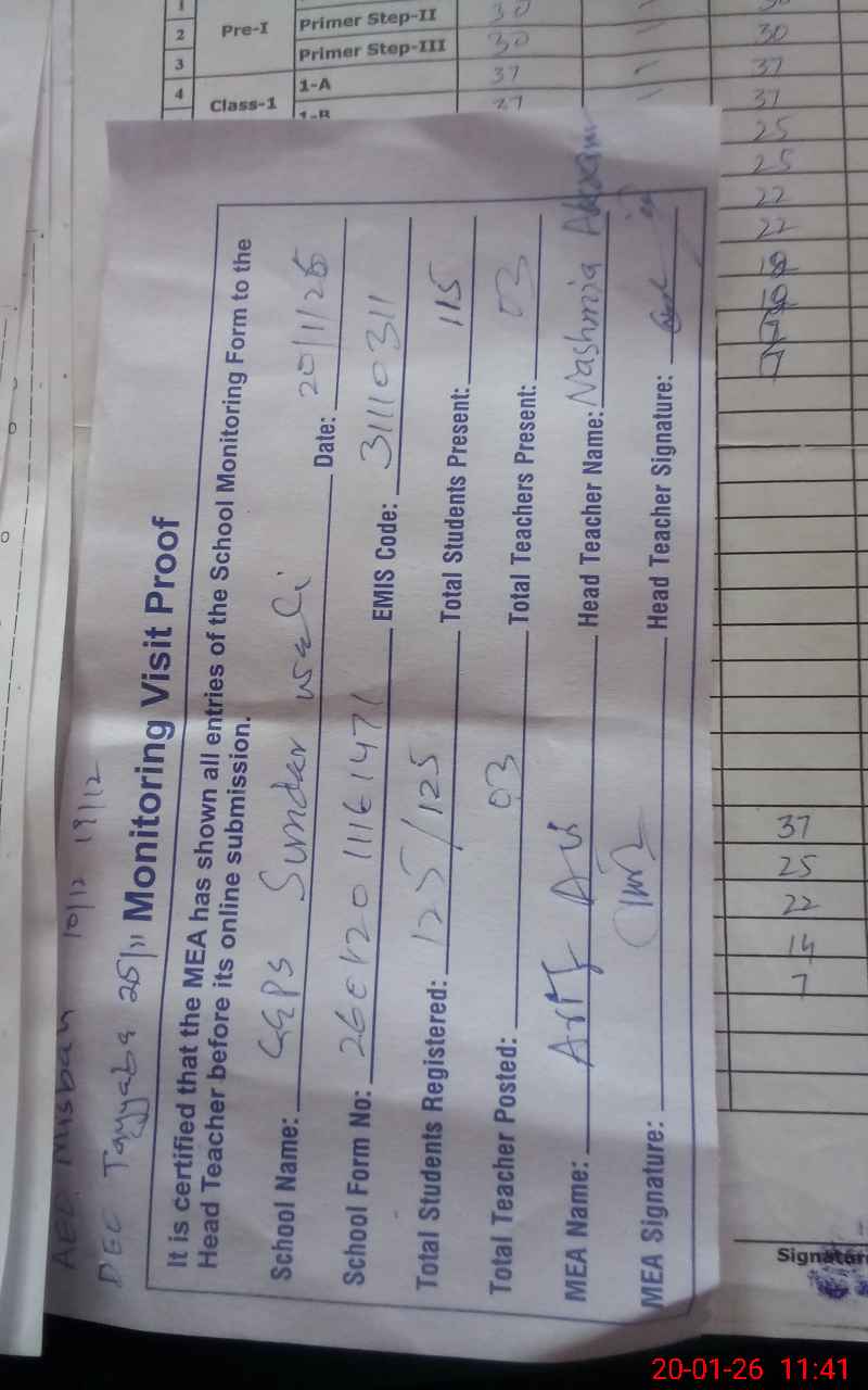 | Remarks (Use Separate Page if Required): Teacher Samreen PST 3110132627216 of GGPS Sunderwali 31110311 transferred / deputed to Karachi 3 years ago but name still exists in SIS as well as in monitoring app 3 classes are being taught under brandas School needs more rooms to accommodate 125 students Sign board on main gate not painted NSB record not complete | |||||