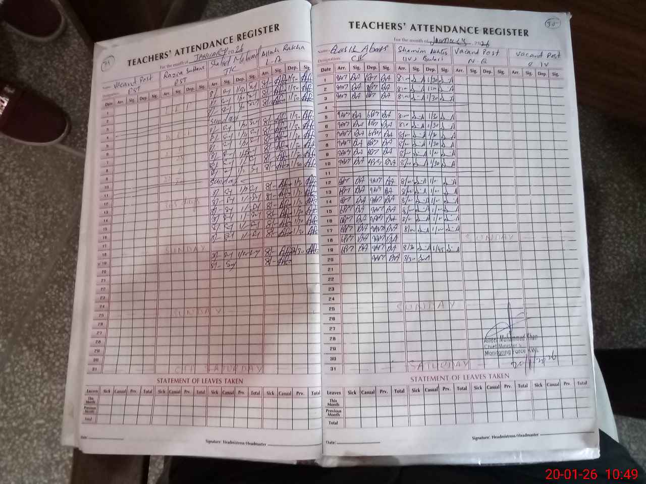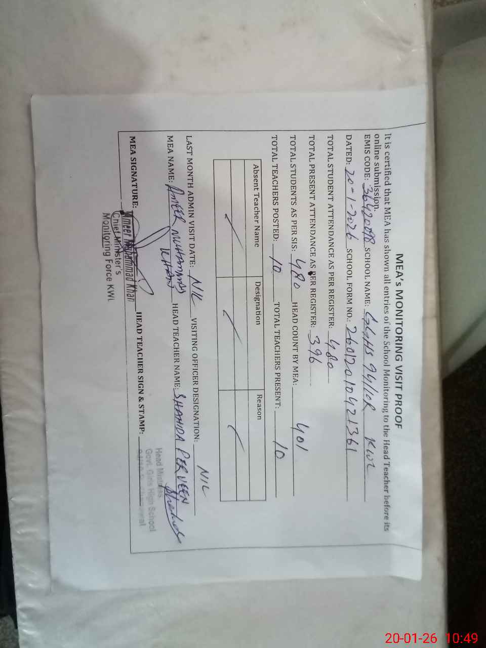 | Attendance Register | Head Teacher | MEA with School | Visit Proof |