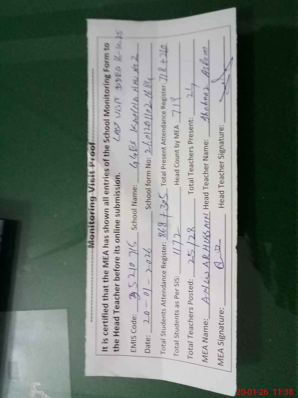 | Attendance Register | Head Teacher | MEA with School | Visit Proof |