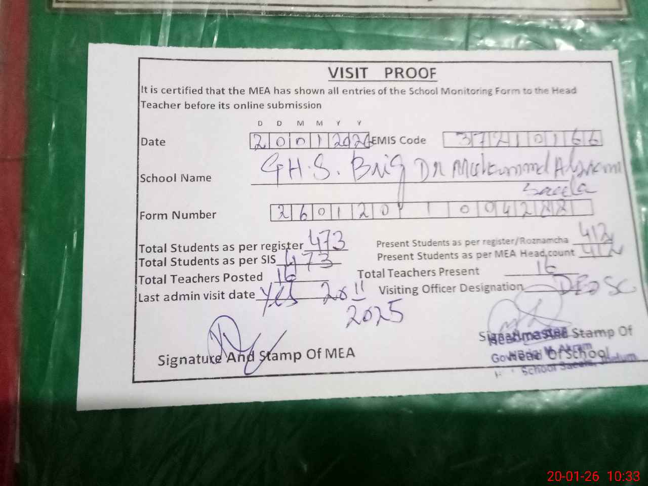 | Certified that this School was Inspected by the Undersigned MEA/DMO Today and the Information Stated Above is as Per Record. | |||||