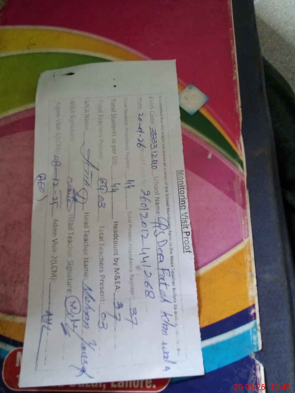 | Attendance Register | Head Teacher | MEA with School | Visit Proof |
