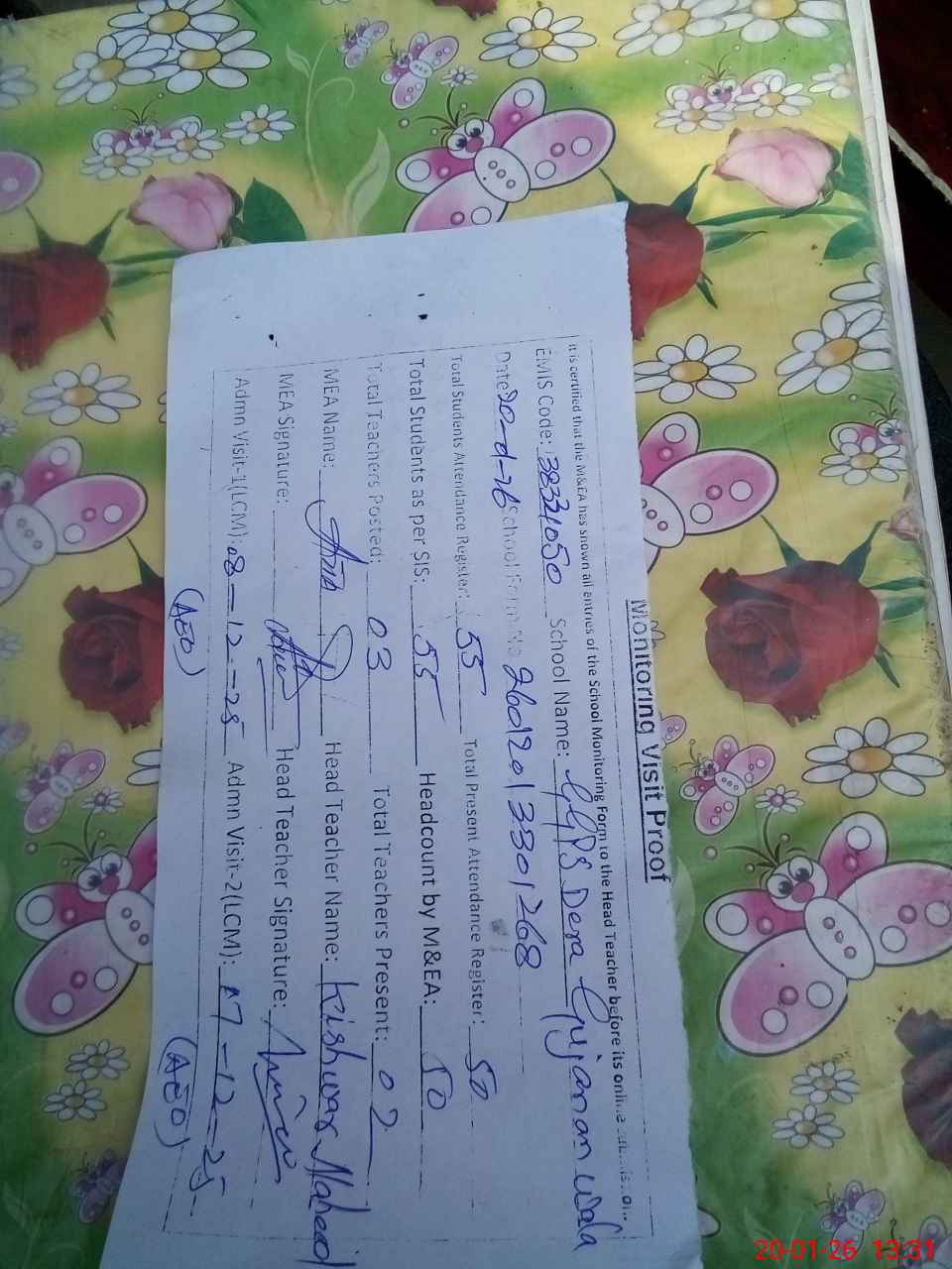 | Attendance Register | Head Teacher | MEA with School | Visit Proof |