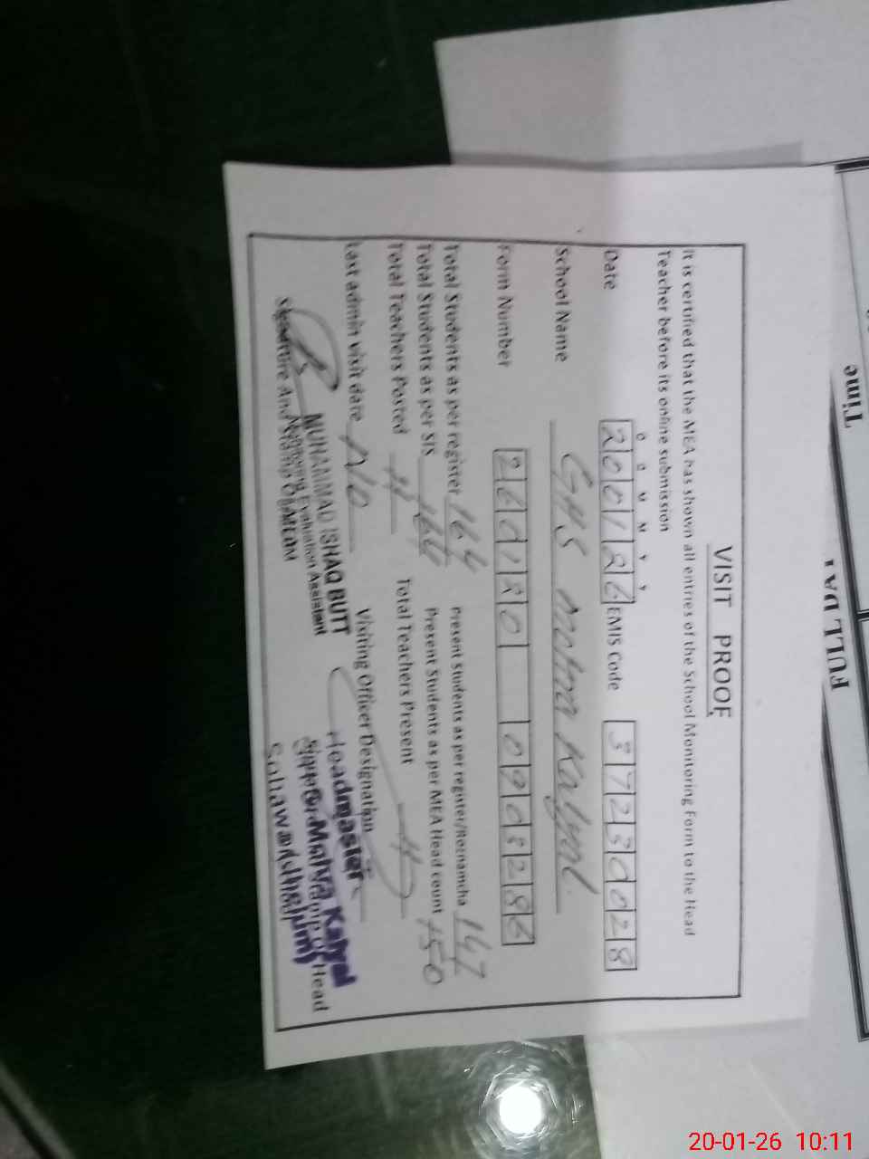 | Attendance Register | Head Teacher | MEA with School | Visit Proof |