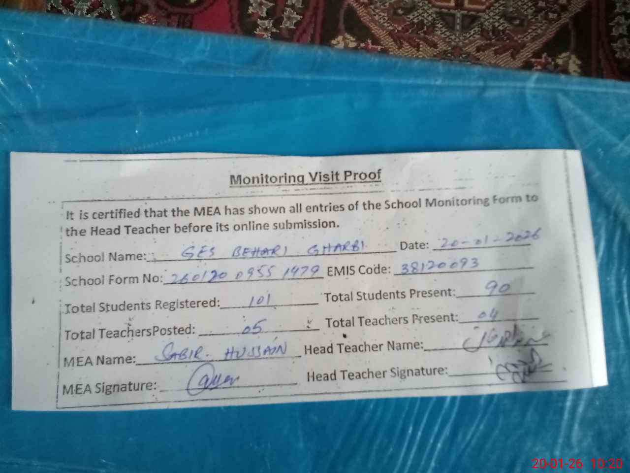 | Attendance Register | Head Teacher | MEA with School | Visit Proof |