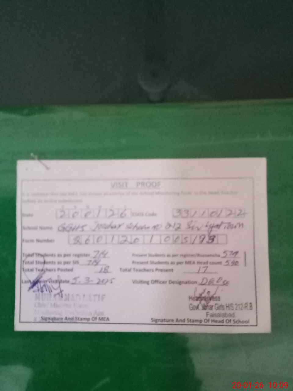 | Certified that this School was Inspected by the Undersigned MEA/DMO Today and the Information Stated Above is as Per Record. | |||||