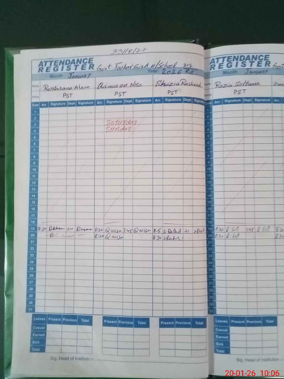 | Remarks (Use Separate Page if Required): Mrs Rukhsana Alam PST today C/ marked but any types of leaves record not provided. | |||||