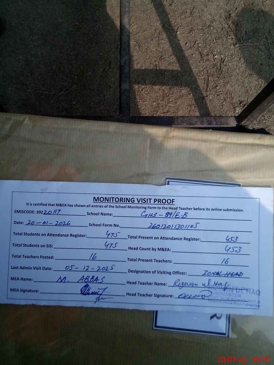 | EMIS Code: 39220117 | Name of School: GHS CHAK NO. 89 EB | |||