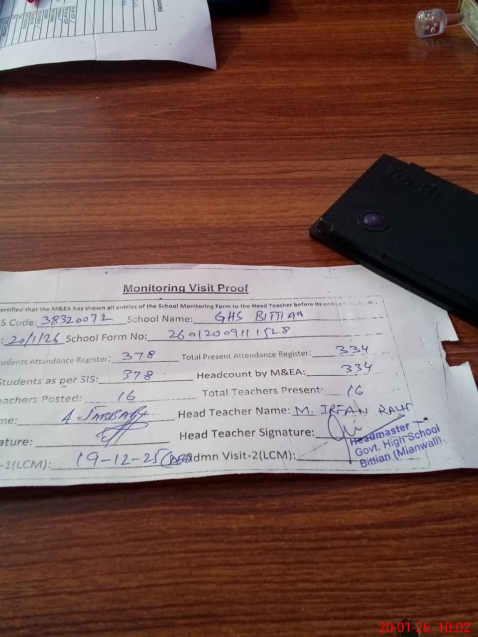 | Attendance Register | Head Teacher | MEA with School | Visit Proof |