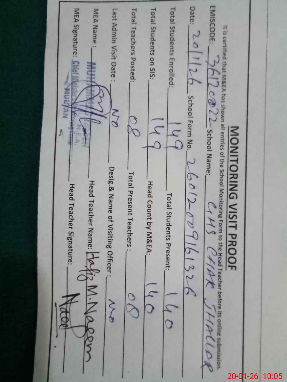 | EMIS Code: 36120022 | Name of School: GHS CHAK JHALLAR SHUJABAD | |||