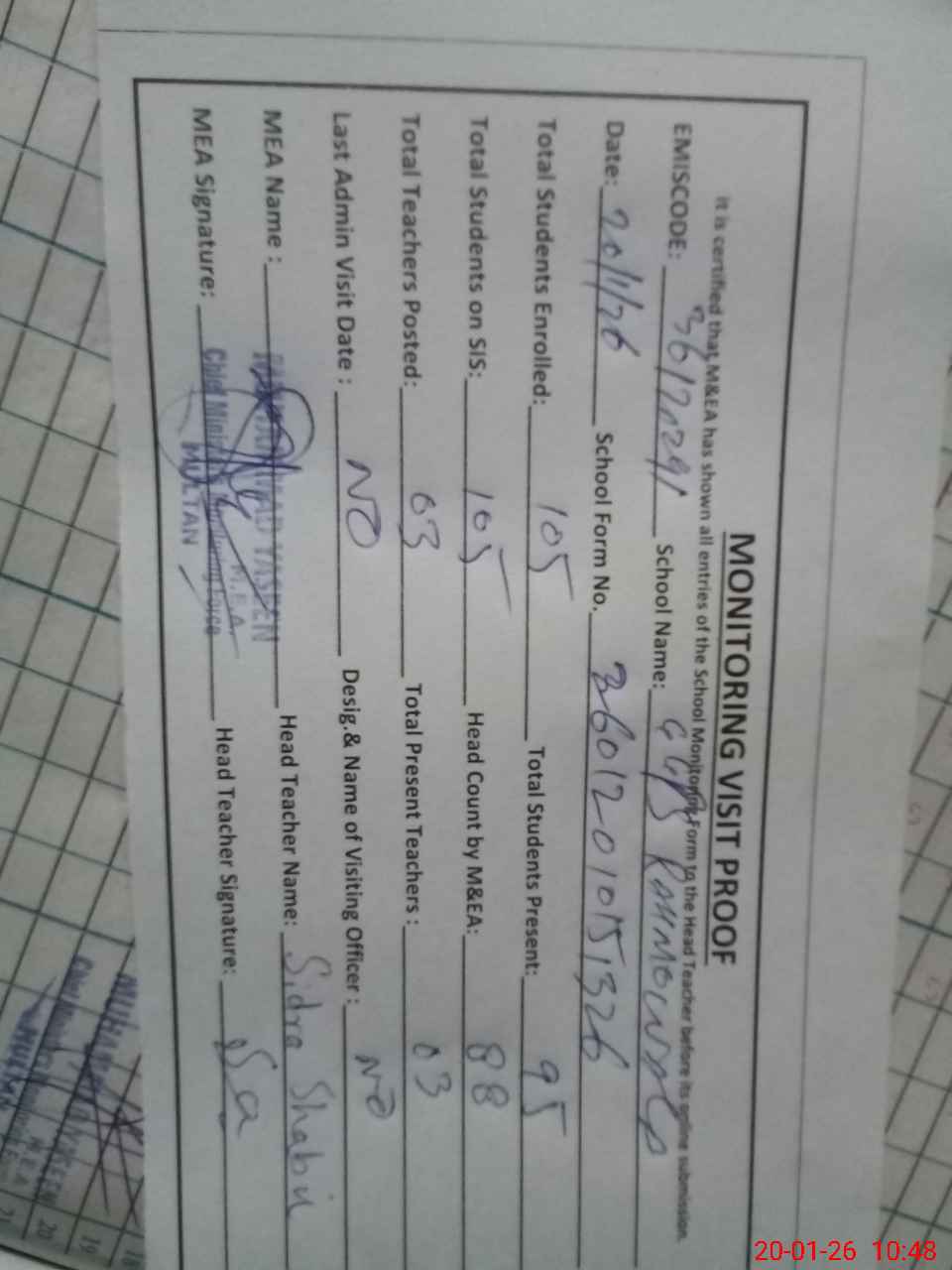 | Attendance Register | Head Teacher | MEA with School | Visit Proof |